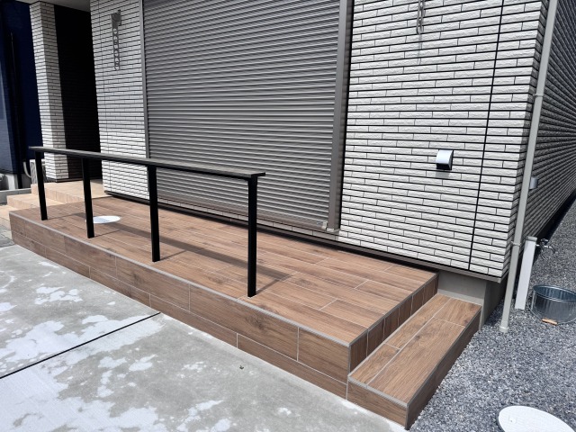 タイルデッキには『アイコットリョーワ ベルダ/D162』の木目調のタイルを貼っております。