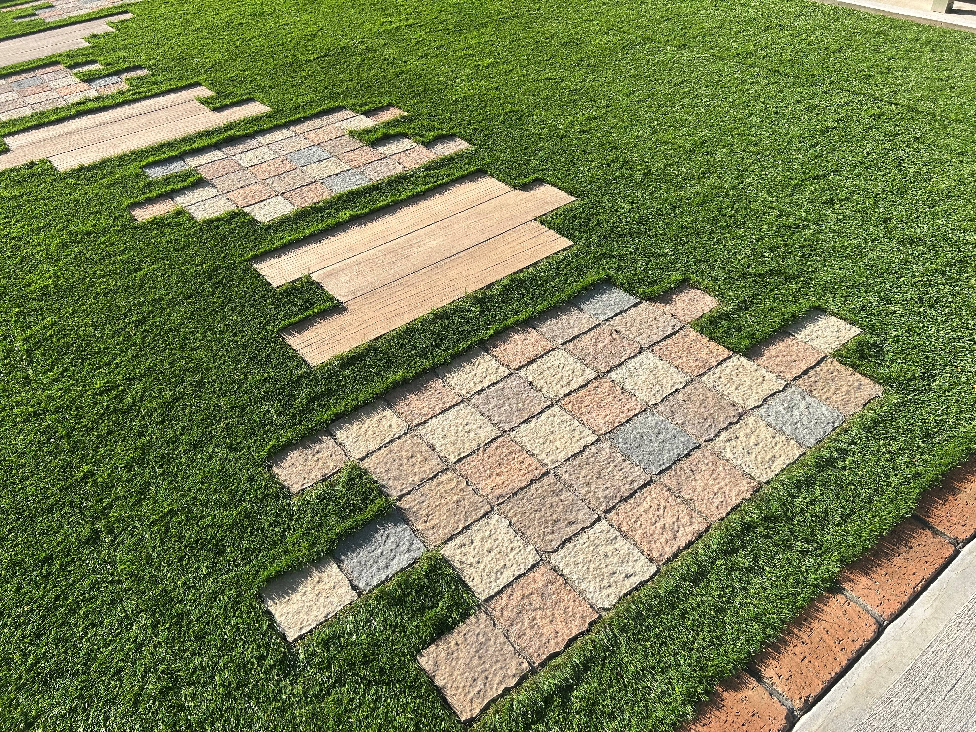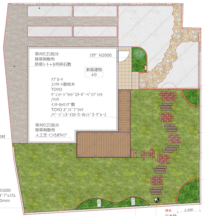 枕木には『TOYO ヴィンテージウッドスリーパーペイブライト/ナッツ』を、インターロッキングは『TOYO ガンデブリック/ベージュ・イエロー・オレンジ・グレー』を使用しています。