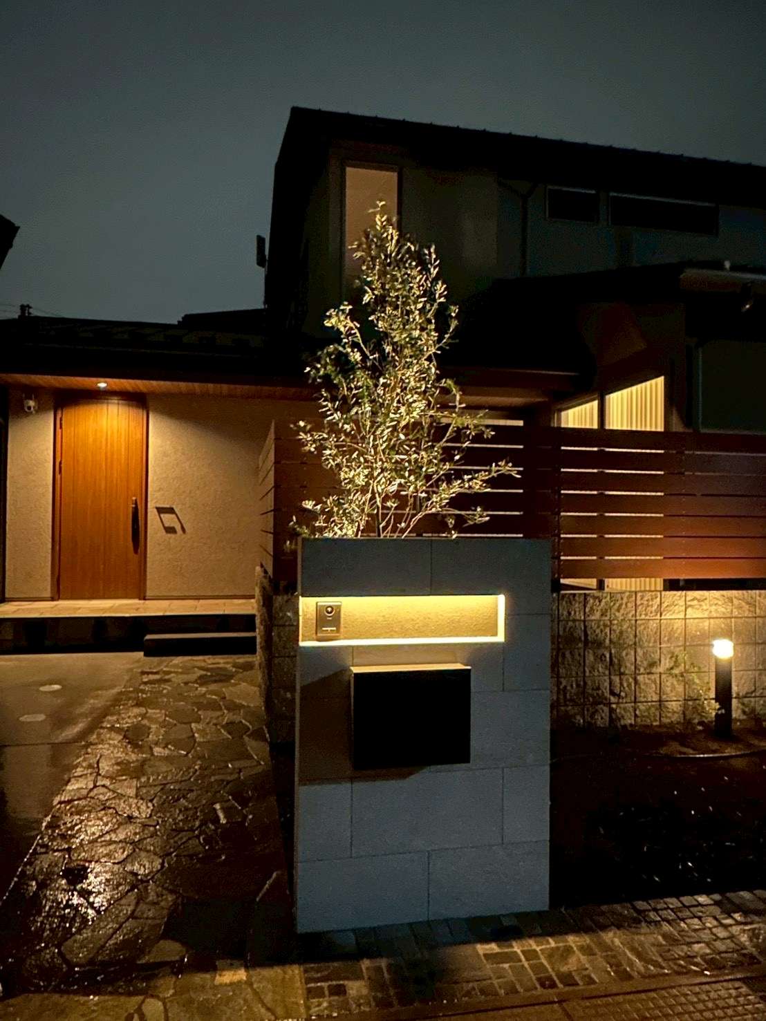 こちらの門柱は照明を仕込んでいるため、夜の様子もとっても素敵なんです✨✨