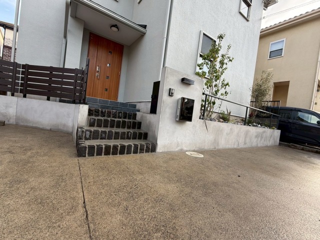 玄関までのアプローチ部分はピンコロを使用して階段を作りました。